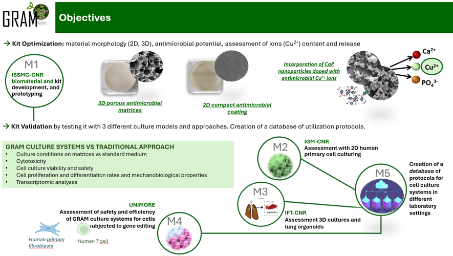 The project aims to combine the cell-supporting action of 2D and 3D matrices with the antimicrobial action exerted by CaP nanoparticles doped with Cu²⁺ ions to obviate the need of antibiotics in culture media.