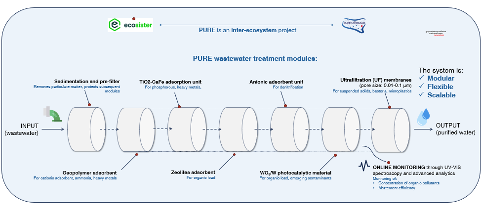 The PURE project aims to develop a water purification system for industries and communities, enabling water reuse and minimizing extraction from surface or groundwater sources in line with environmental sustainability and circular economy principles.