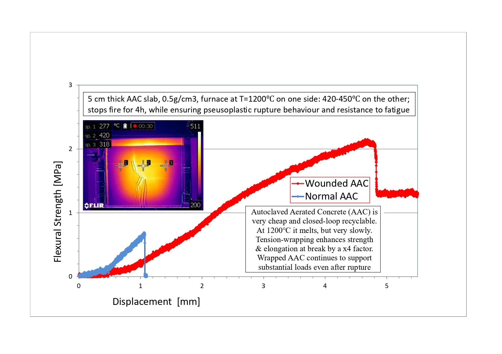 AAC (Autoclaved Aerated Cements) have been identified as highly interesting materials, especially when their mechanical performances are increased using a wrapping-in-tension approach with glass fiber. This allows a disruptive increase in mechanical performance (in terms of flexural strength, fatigue resistance, and elongation at break) with minimal cost and C-footprint increase.